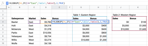 =VLOOKUP(D4,IF(C4=”East”,Table1,Table2,2,TRUE)