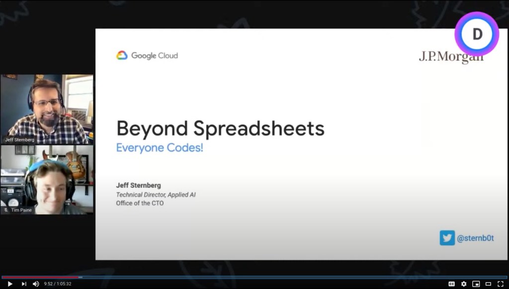 I co-presented with Tim Paine from J.P. Morgan. Tim and I met a few months ago and were slated to present this in mid-March, in-person, at Google NYC. That was canceled because of the COVID-19 pandemic, of course, like all other tech meetups around that time.